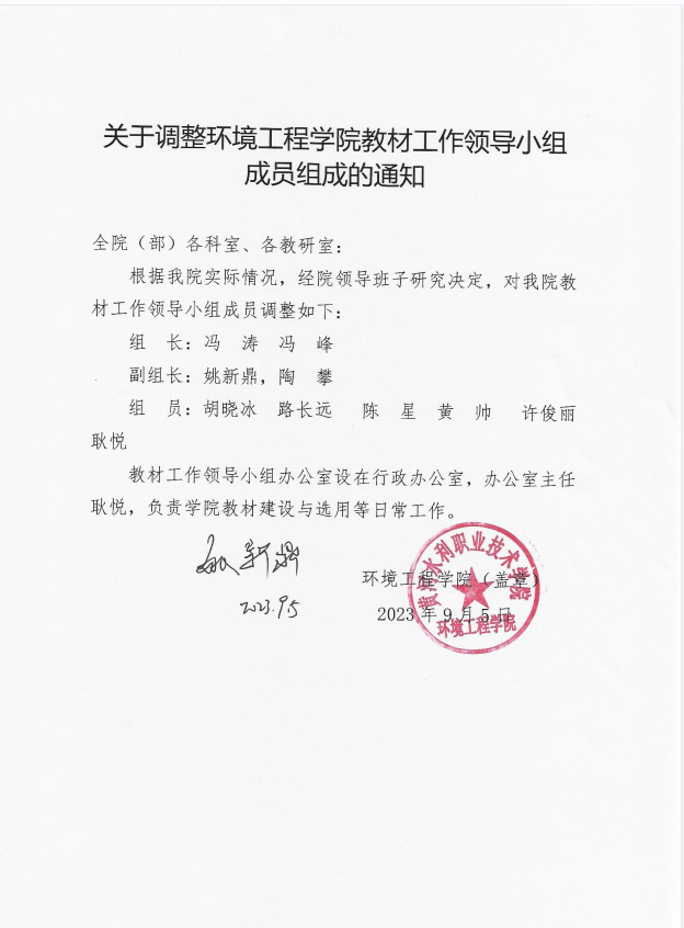 关于调整环境工程学院教材工作领导小组成员组成的通知