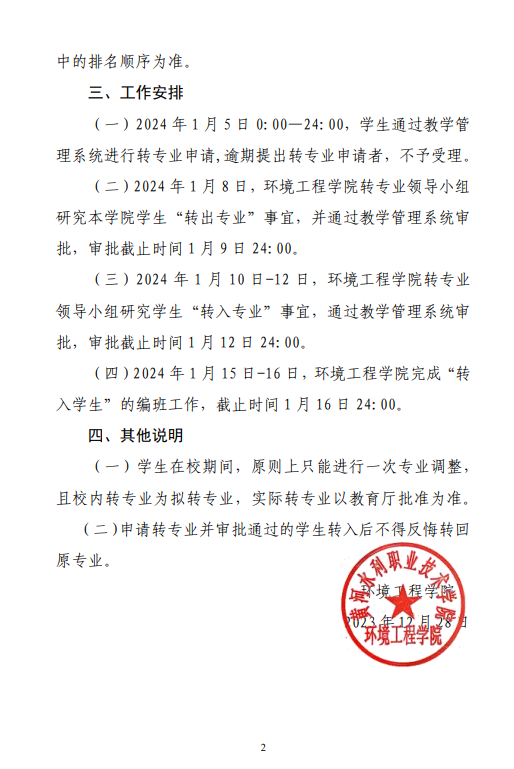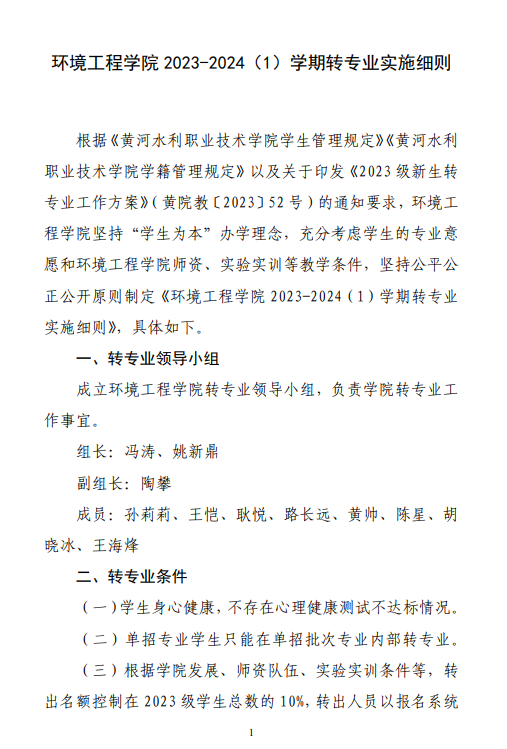 环境工程学院2023-2024(1)学期转专业实施细则