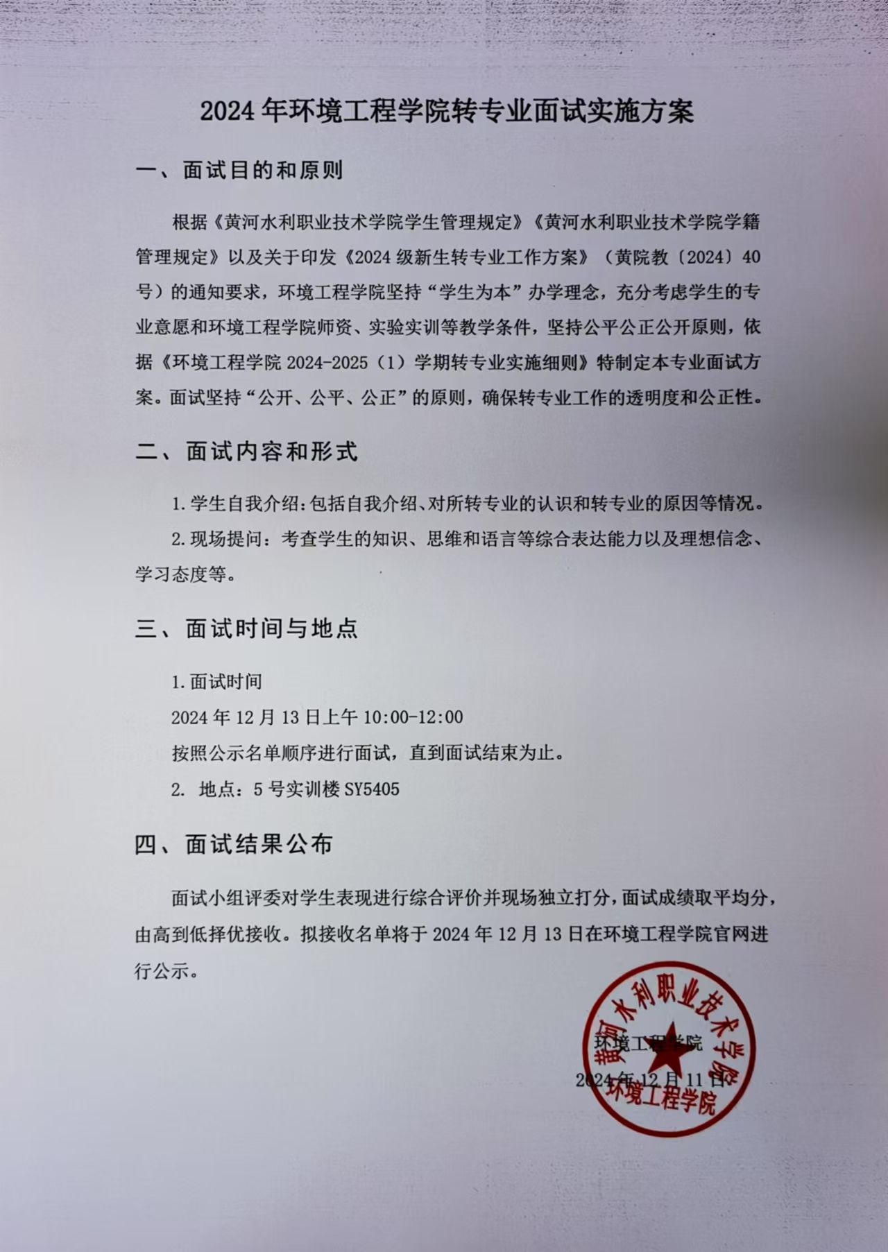 根据《黄河水利职业技术学院学生管理规定》《黄河水利职业技术学院学籍管理规定》以及关于印发《2024级新生转专业工作方案》(黄院教〔2024〕40号)的通知要求,环境工程学院坚持“学生为本”办学理念,充分考虑学生的专业意愿和环境工程学院师资、实验实训等教学条件,坚持公平公正公开原则,依据《环境工程学院2024-2025(1)学期转专业实施细则》特制定本专业面试方案。面试坚持“公开、公平、公正”的原则,确保转专业工作的透明度和公正性。