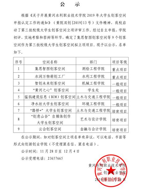 根据《关于开展黄河水利职业技术学院 2019 年大学生创客空间申报认定工作的通知》(黄院双创[2019]13 号)文件精神,我院进行了第三批校级大学生创客空间的申报工作。其中马金菊老师申请的《净水坊大学生创客空间》获得立项,并于2019年11月28日起开始公示。