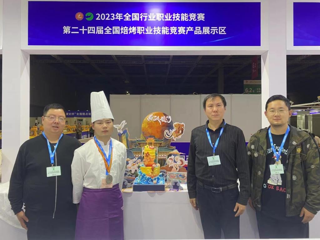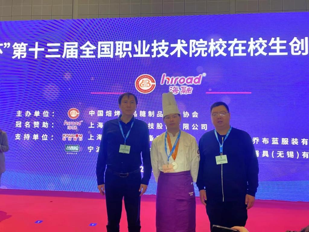 第十三届“海融杯”全国职业技术院校在校生创意西点技术大赛由中国焙烤食品糖制品工业协会主办,来自国内外食品焙烤行业的专家和嘉宾担任评委。大赛自启动以来,共有来自全国各地上百所学校的近千名学生参赛,参赛作品达到数千份,最终81名选手从初赛中脱颖而出并成功晋级总决赛。本赛项要求在2小时内完成一个完整的西式糕点,参赛选手李耀辉不负众望,凭借良好的心理素质、过硬的技能本领、饱满的竞技状态,从众多参赛选手中脱颖而出。指导教师全天候陪伴学生进行训练,与学生同吃同住,细心陪伴、耐心指导,最终取得优异成绩。