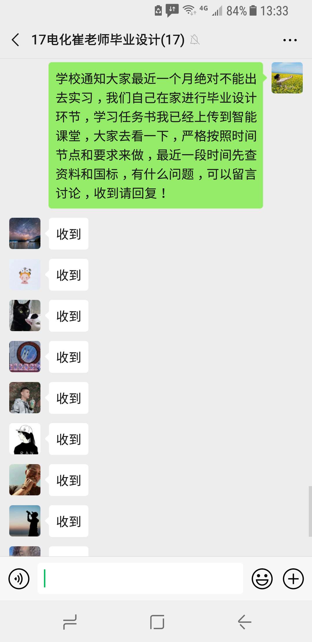 自接到上级通知开始,环境工程学院就开始着手准备这项工作,院党总支书记王国英亲自部署,要求每一名毕业班的学生都要有一名指导老师对其进行一对一管理,全体指导教师要认真做好顶岗实习的排查、监控,及时与顶岗实习单位沟通,实行毕业生状况“日报告、零报告”制度。校企合作办公室主任及2017级毕业班辅导员王恺老师对全院毕业班263名学生(入伍的除外)的所在位置、对应指导老师安排等信息进行了统计,并上报招生就业服务中心。学院毕业班顶岗实习指导教师们陆续建立了自己所指导顶岗学生的微信群,每天通过微信群传达上级精神,与学生进行交流,要求学生每天必须在微信群里发送健康状况和自己所在的位置。对于一些正在上班的学生以及一些在疫情较为严重地区的学生,指导老师实行单独交流、单独管理政策,确保每天及时掌握这些学生的最新动态。