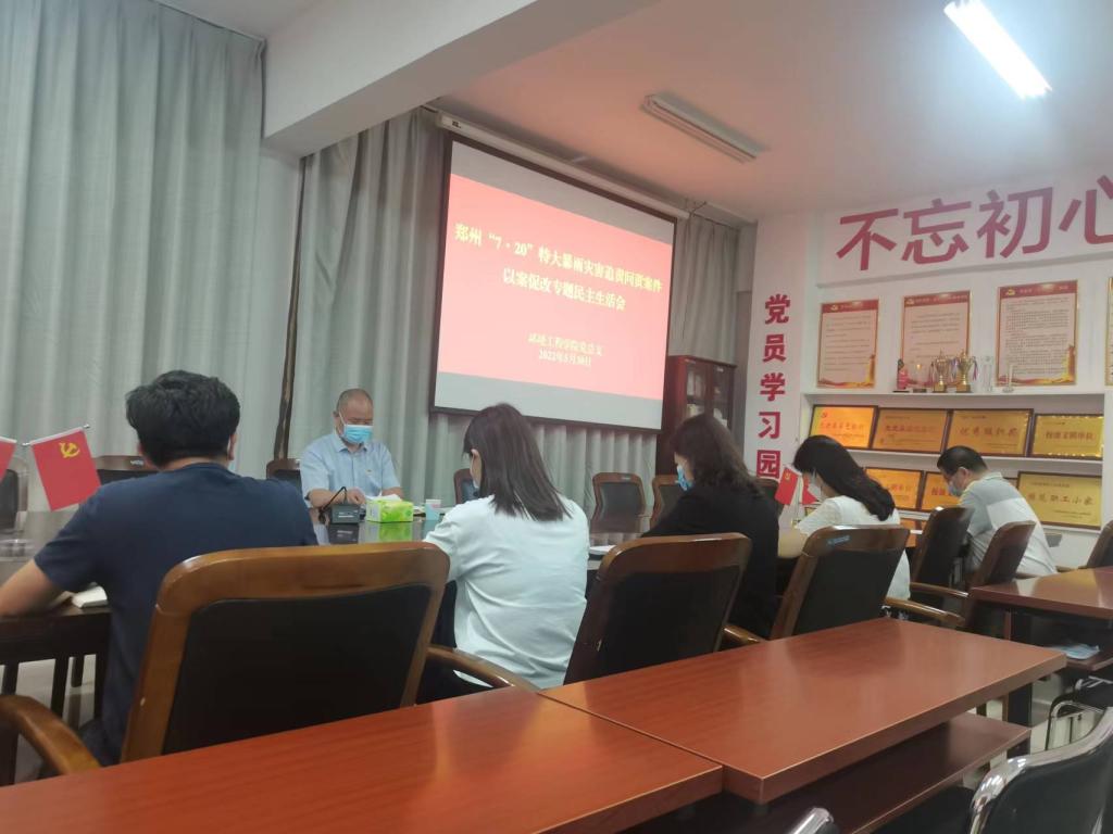 5月30日下午,环境工程学院领导班子在SY5405会议室召开郑州“7·20”特大暴雨灾害追责问责案件以案促改专题民主生活会。党委副书记、工会主席杨士恒全程参加并指导了此次专题民主生活会。会议由环境工程学院党总支书记高琼主持,院长冯峰参加会议,学院科级干部列席会议。