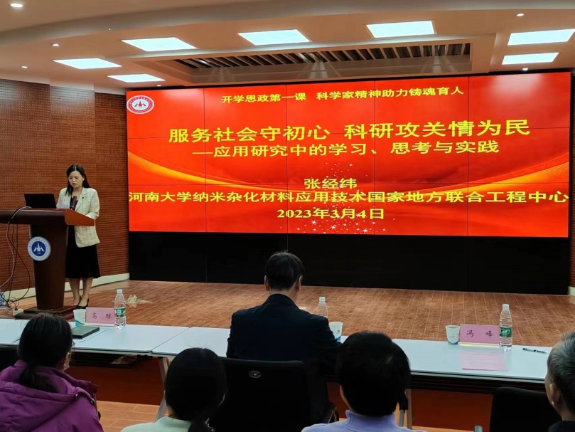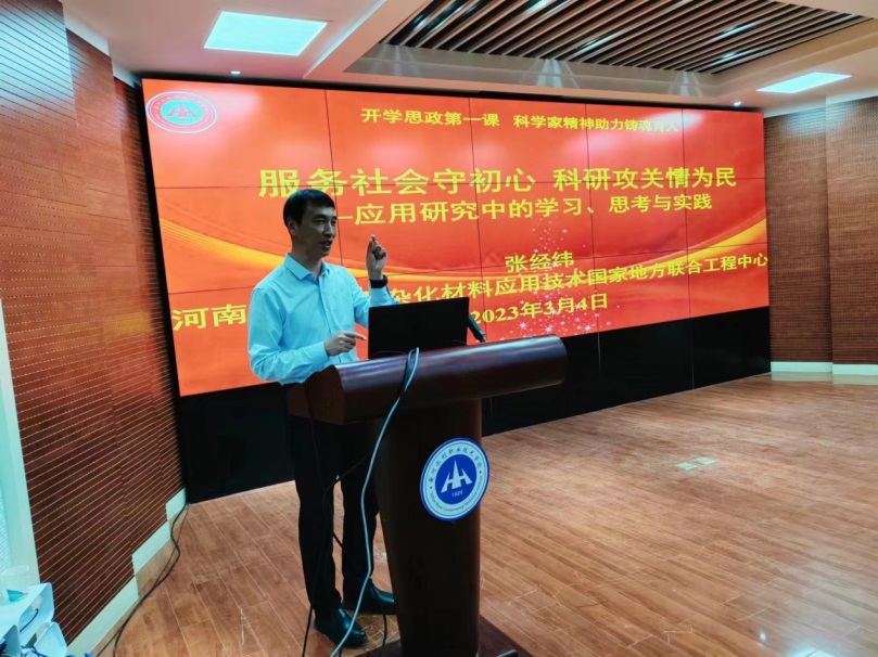 为全面推进课程思政建设,不断提高人才培养质量,帮助青年教师和大学生树立勇于创新、甘于奉献的敬业精神,3月4日,环境工程学院特邀河南大学纳米杂化材料国家地方联合工程技术研究中心常务副主任张经纬教授为全院师生做“开学思政第一课·科学家精神助力铸魂育人”主题报告。环境工程学院党总支书记高琼、院长冯峰、副院长姚新鼎以及部分师生代表参加会议,报告会由党总支书记高琼主持。