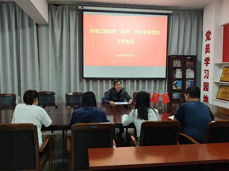 为了维护国庆节、中秋节期间校园的安全稳定,环境工程学院9月27日上午在sy5405会议室召开“双节”期间学生安全稳定工作会议。学院党总支副书记陶攀,分团委书记孙莉莉和各年级辅导员参加会议。
