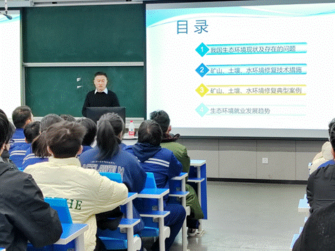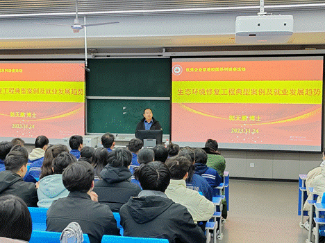 报告中,郭天鹏博士结合自己多年工作和创业所取得的成果,从环境工程学院学生专业学习和就业发展的需求出发,做了《生态环境修复工程典型案例及就业发展趋势》为主题的讲座。讲座从我国生态环境现状及存在的问题,矿山、土壤、水环境修复技术措施及典型案例,生态环境就业发展趋势四个方面出发,让学生了解到生态修复一线产业面临的问题,从矿山、土壤和水环境等较受关注的领域出发,介绍了目前使用较为广泛和先进的修复技术措施,并以典型案例做深度剖析,给大家以更为直观和生动的讲解。在介绍完专业知识和技能之后,郭博士更是从企业家的身份出发,向师生们分享了生态环境修复技术专业未来的就业方向、产业需求和发展趋势,鼓励同学们抓住当下生态文明建设的大好时机,努力夯实专业基础,以积极向上、锐意进取的状态在生态环保领域发光发热。