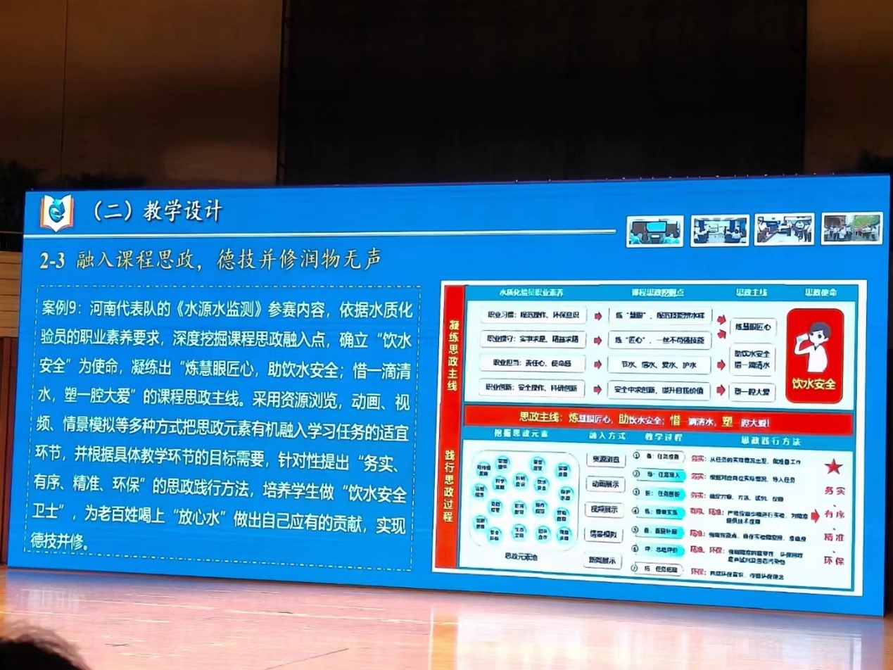 我校环境工程学院崔鹏老师带领的《水源水监测》教学团队,获奖作品出自环境监测技术专业的课程《水环境监测》,是2022年河南省职业教育和继续教学课程思政示范课。全国职业院校技能大赛教学能力比赛评判组组长姜丽萍老师在国赛闭幕式的分享会上,向来自全国的决赛团队教师共享了20个教学团队的特色优点,我校本次参赛作品《水源水监测》以“融入课程思政,德技并修润物无声”的课程思政设计被作为精彩展示和引领示范同大家分享。