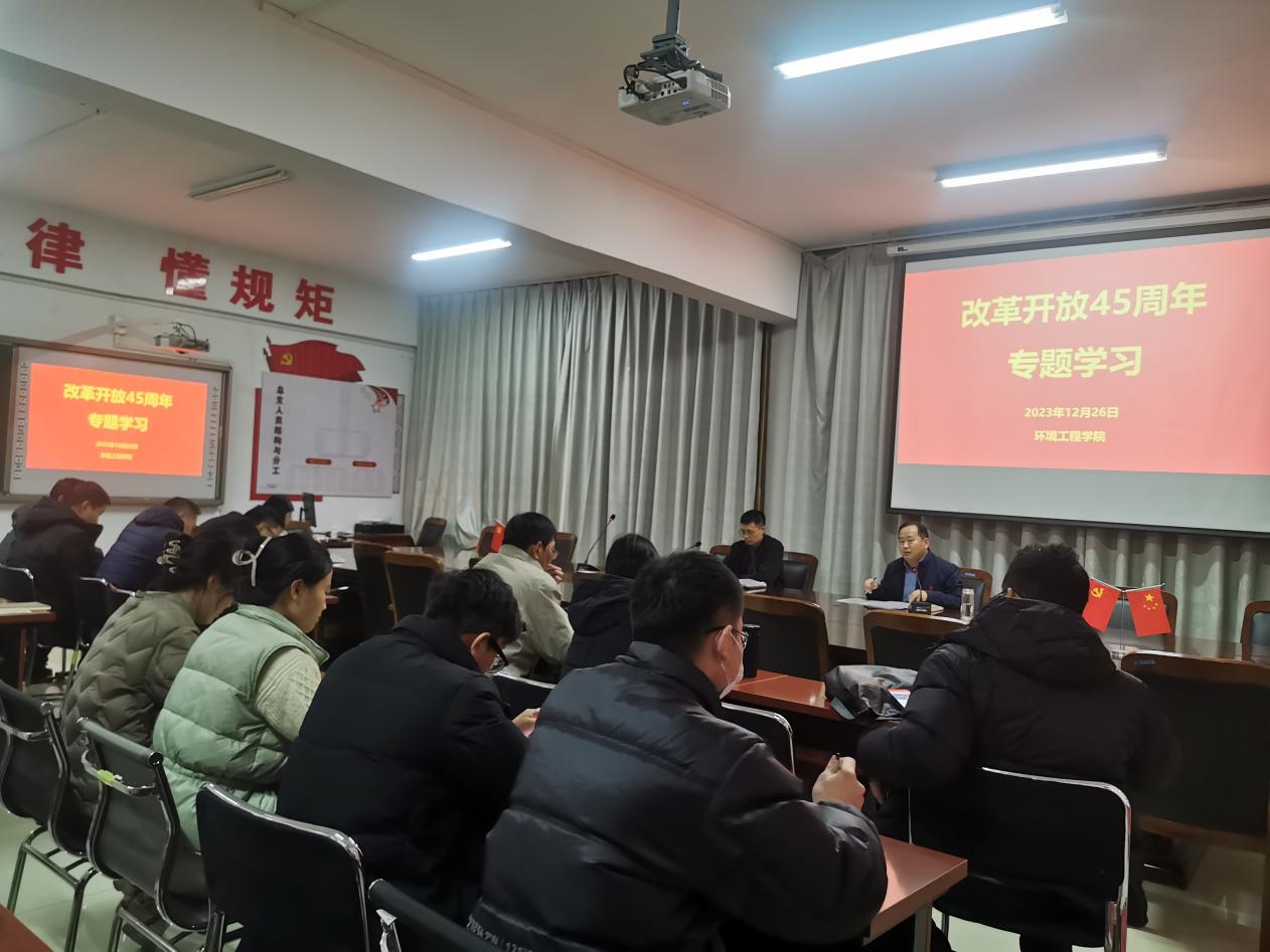 为深入开展学习贯彻习近平新时代中国特色社会主义思想主题教育,积极践行伟大改革开放精神,激发广大教师创新创造精神动力,12月26日下午,环境工程学院在SX5405会议室召开改革开放45周年专题学习会。会议由党总支书记冯涛主持,全体教职工参加会议。