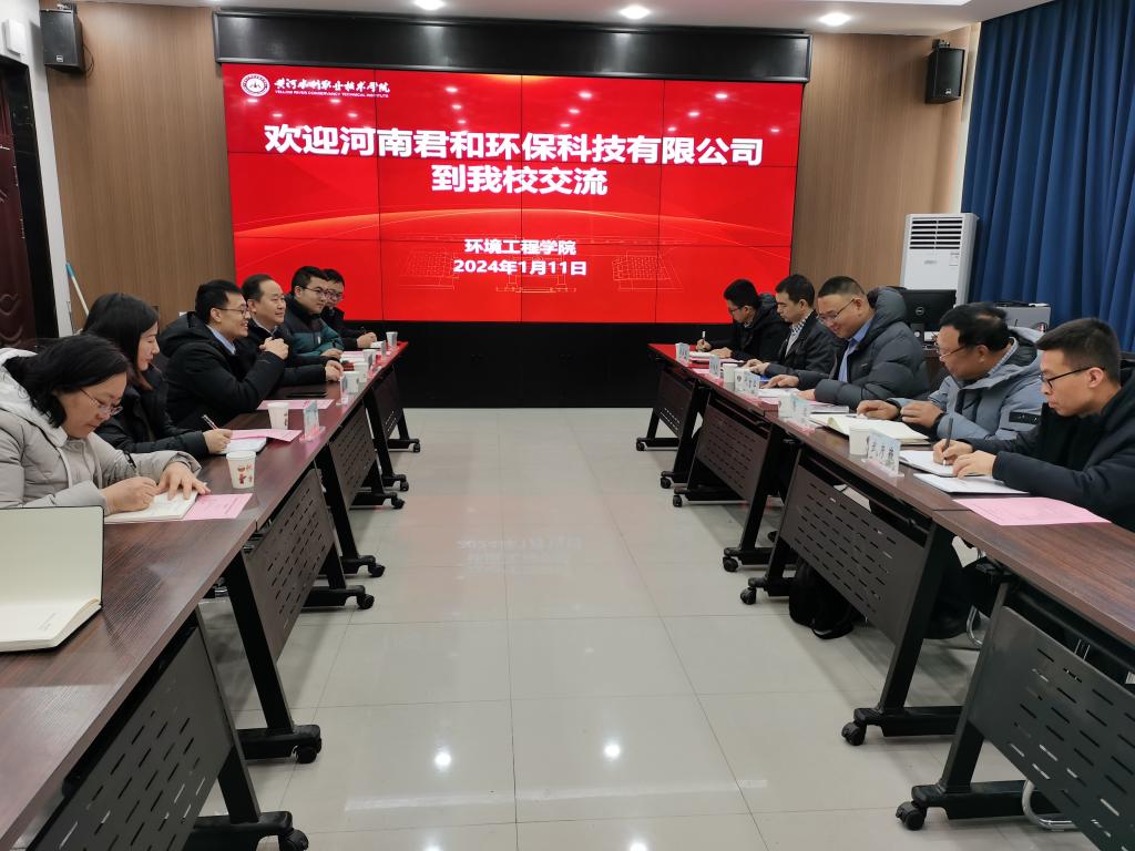 1月11日上午,河南君和环保科技有限公司总经理代吉华、总工唐启一行5人到我院交流座谈。环境工程学院党总支书记冯涛、副院长姚新鼎,各个专业负责人及部分骨干教师参加座谈。会议由副院长姚新鼎主持。