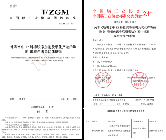 近日,中国膜工业协会批准发布了黄河水利职业技术学院为第一起草单位的团体标准《地表水中12种橡胶添加剂及氧化产物的测定 液相色谱串联质谱法》(T/ZGM 008-2024)。此项标准由环境工程学院陈星博士团队负责起草,为我校首次以第一起草单位发布生态环境领域相关团体标准。