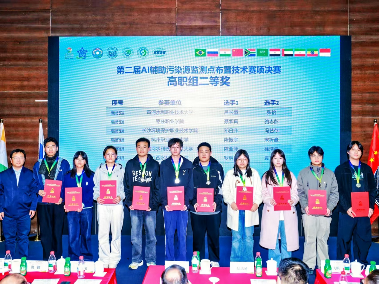 大赛中我校参赛队伍的优异表现,离不开学校领导与相关部门的高度重视和鼎力支持。未来,环境工程学院将持续立足 “AI + 环境” 融合创新赛道,紧跟 AI 技术与环境工程领域的发展趋势,聚焦高素质技术技能人才培养,着力打造兼具国际视野、创新精神与实践能力的专业队伍,既为 “AI + 环境” 产业升级注入鲜活动能,也为金砖国家及 “一带一路” 沿线国家的生态环保数字化技术合作与发展贡献更大力量。