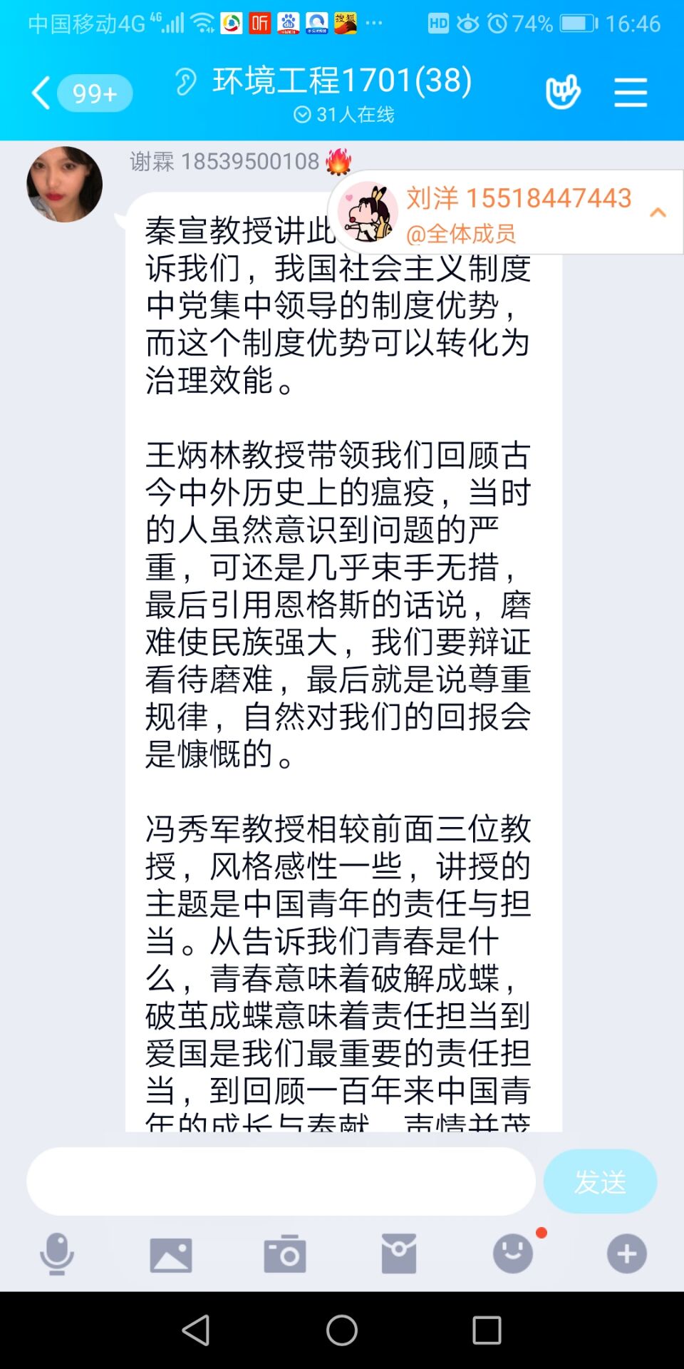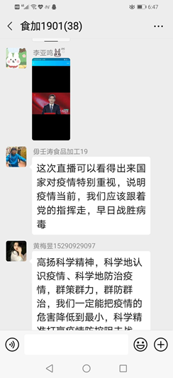 全院所有学生积极按时参加,刚开始由于网络原因一直进不去,各位临时班主任互相打电话、微信留言,积极找途径,最后都能顺利收看直播。观看学习后,学生们积极发表感言,通过这次疫情,我们发现人与自然的关系出现弊端,人类本身就是环境的产物,在伤害环境的同时,环境也在伤害着我们。马克思说过人靠自然界生活人类和自然是一个有机整体,作为人类我们要有尊重自然,尊重规律。增强忧患意识、强化底线思维。另一方面也发现了中国共产党领导的中国特色社会主义在这次疫情中,彰显了党中央集中统一领导的强大力量,也彰显了党在如此巨大公共卫生灾难面前的应对能力。