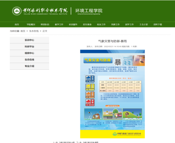 除了开放周活动以外,还通过线上线下方式,不断地拓宽科普宣传渠道。环境工程学院官网上传了洪水、暴雨防灾减灾等视频、图片资料近30份;在校园内宿舍区、食堂区、教学区、办公区等张贴海报20处;利用校团委公众号、院团总支公众号、班级微信群、教师微信、抖音号等多媒体形式,对学生进行了广泛宣传气象防灾减灾科普知识,扩大宣传活动的覆盖范围。