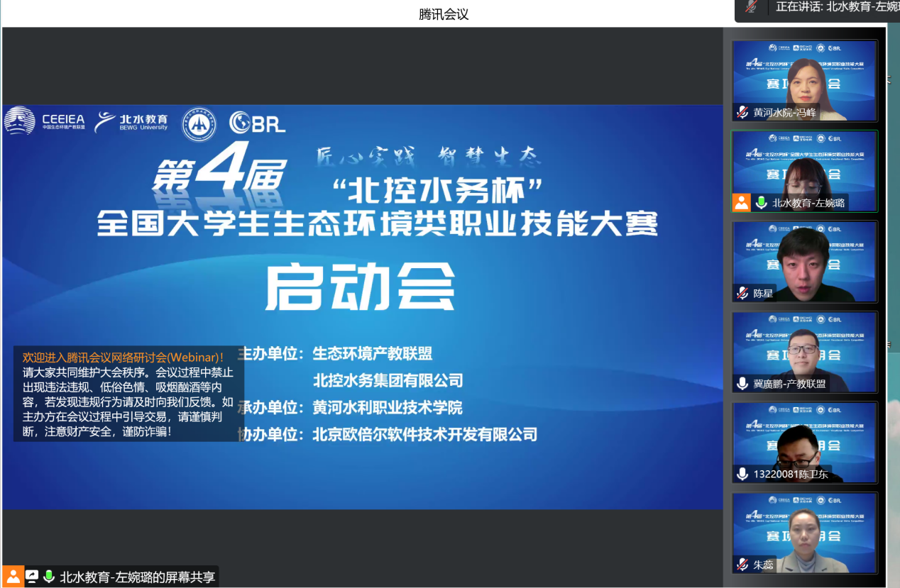 11月15日上午,由生态环境产教联盟、北控水务集团有限公司主办,我校承办的第四届“北控水务杯”全国大学生生态环境类职业技能大赛启动会及赛项说明会以在线直播会议的形式召开。北控水务集团北水教育中心副总经理冀广鹏、我校环境工程学院院长冯峰、环境监测技术专业负责人陈星,北京欧倍尔软件技术开发有限公司副总经理张成林、大赛裁判长陈卫东教授,以及来自全国32所高校近60参赛队指导老师参加了会议,会议由北控水务集团左婉璐主持。