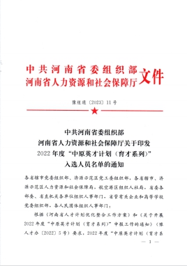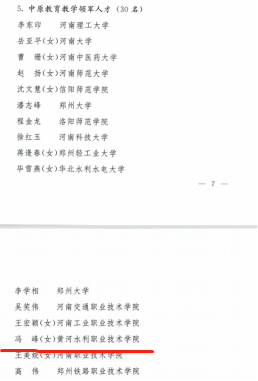 日前,中共河南省委组织部、河南省人力资源和社会保障厅联合发文,公布了2022年度“中原英才计划(育才系列)”入选人员名单,我校环境工程学院冯峰教授成功入选中原教育教学领军人才。