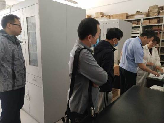 王哲嵘老师带领检查人员首先进入我院化学试剂专用储藏室进行检查,储藏室干净整洁、制度上墙;防火、防潮设施完备,并能合理利用有效资源;防盗措施齐全,物品摆放整齐;安装有高清摄像头;化学品购置、领用信息完备。
