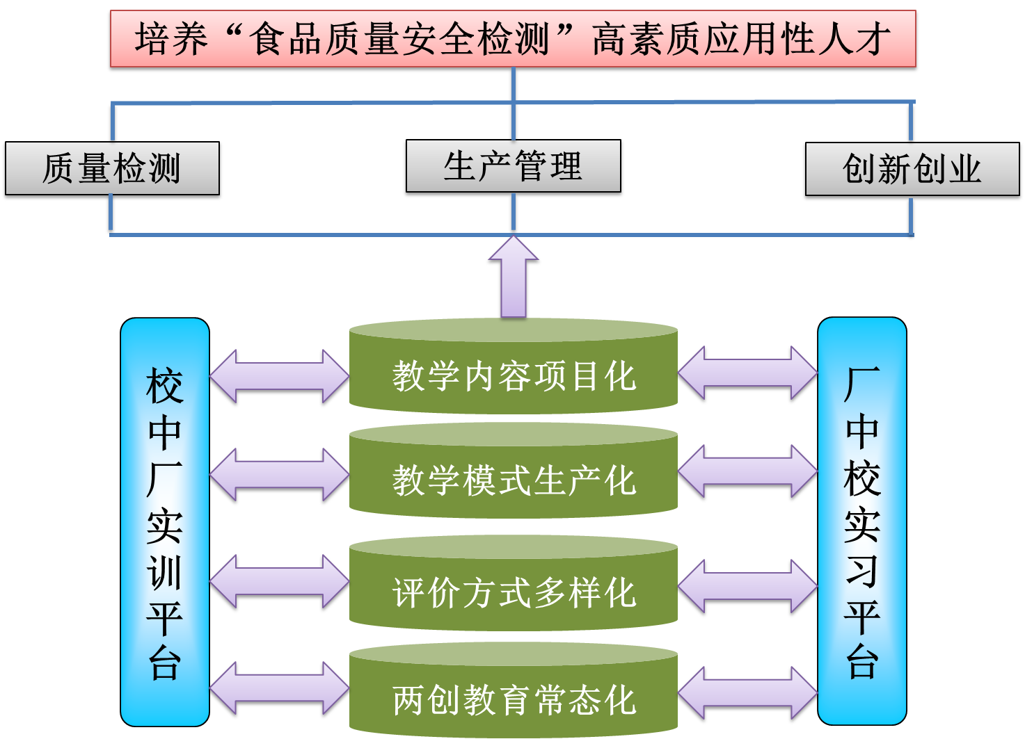 食品质量与安全专业以校企共同体为平台,企业需求为先导,培养基于“服务地方性”、“创新应用型”人才培养定位和“注重创新,注重实践”的人才培养理念,紧密围绕地方经济建设和社会需求,结合专业特点,探索食品质量与安全专业“一主线、两平台、三层次、四举措”才培养新模式。“一主线”是指以培养食品质量与安全高素质应用性人才为主线;“两平台”是指基于校内生产性实训平台和校外教学性实习平台;“三层次”是指精通食品安全检测技术,满足检验岗位,二是熟悉安全标准和法规,胜任生产管理任务,三是具备一定的创新思维和创业能力,提升职业能力,升华自我价值;“四举措”是指教学内容项目化,教学模式生产化,评价方式多样化和两创教育常态化。