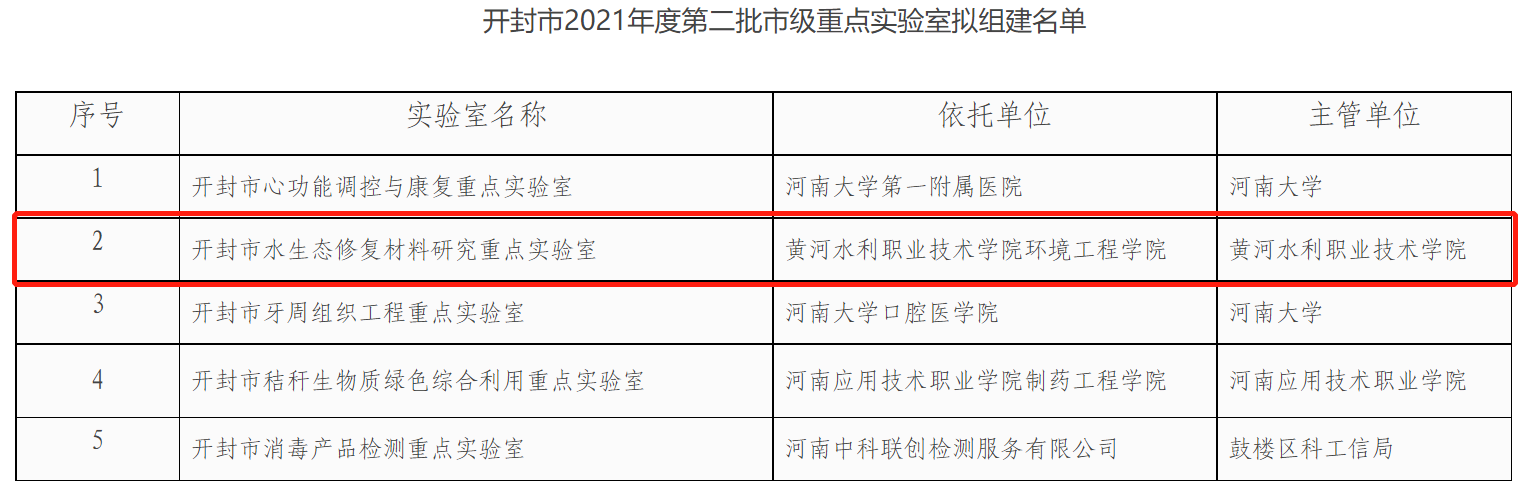 近日,开封市科学技术局公布了2021年第二批市级重点实验室建设名单,黄河水利职业技术学院环境工程学院申报的“开封市水生态修复材料研究重点实验室”获批。