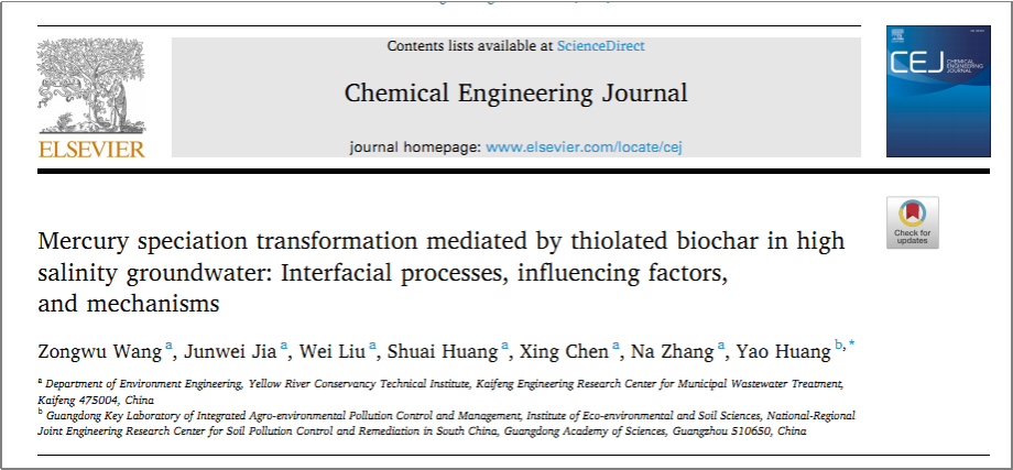 近期,我校环境工程学院王宗舞博士团队最新研究成果“Mercury speciation transformation mediated by thiolated biochar in high salinity groundwater: interfacial processes, influencing factors, and mechanisms”在国际工程技术类顶级期刊(中科院分区中为工程技术/环境类1区Top期刊)《Chemical Engineering Journal》(2023年期刊最新影响因子为15.1)在线发表。黄河水利职业技术学院为第一署名单位,王宗舞为第一作者,这是我校再次以第一作者单位发表中科院一区顶级期刊论文,创发表高影响因子、高水平期刊论文的新高。