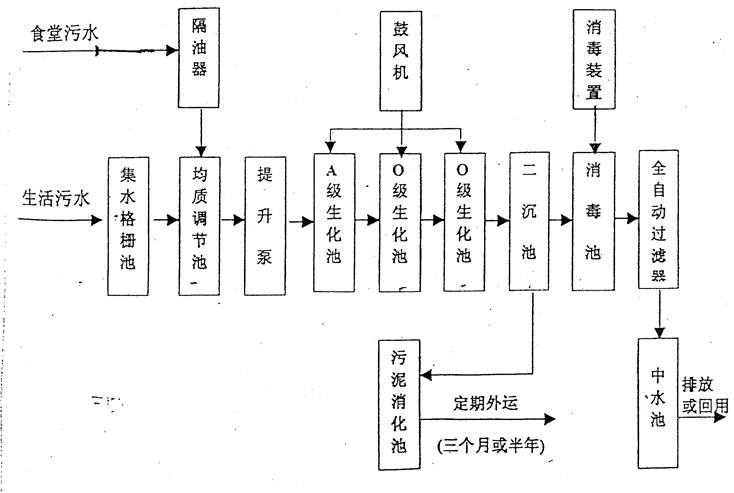 污水处理厂采用A/O接触氧化法,该工艺技术成熟、运行稳定,处理成本较低。主要由格栅、调节池、 A级生化池、O级生化池、二沉淀池、二氧化氯发生器、消毒池、过滤器、污泥池等构筑物(设备)组成 。其工艺流程如下图所示 。