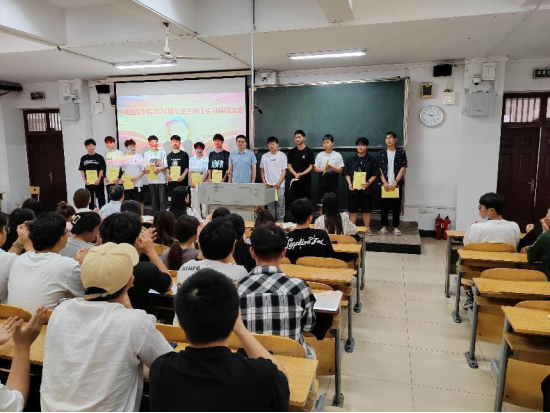 最后,举行了环境工程学院2024届毕业生岗位实习拜师大会。学院教师代表路长远、陈星、黄帅分别上台与自己指导的学生合影,并现场向学生发放了《岗位实习经历证书》等材料。