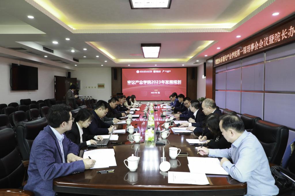 仪式结束后,产业学院在行政楼二楼会议室召开第一届理事会会议暨院长办公扩大会议。产业学院理事长胡昊作关于产业学院章程起草的说明,理事会全体成员审议章程并表决通过。随后,冯峰院长对产业学院2023年度发展规划进行汇报,与会成员就计划开展的师资队伍建设、新型教材开发、教学方法革新、科研水平提升等八项重点工作进行了交流研讨,并对产业学院未来建设发展提出建议。