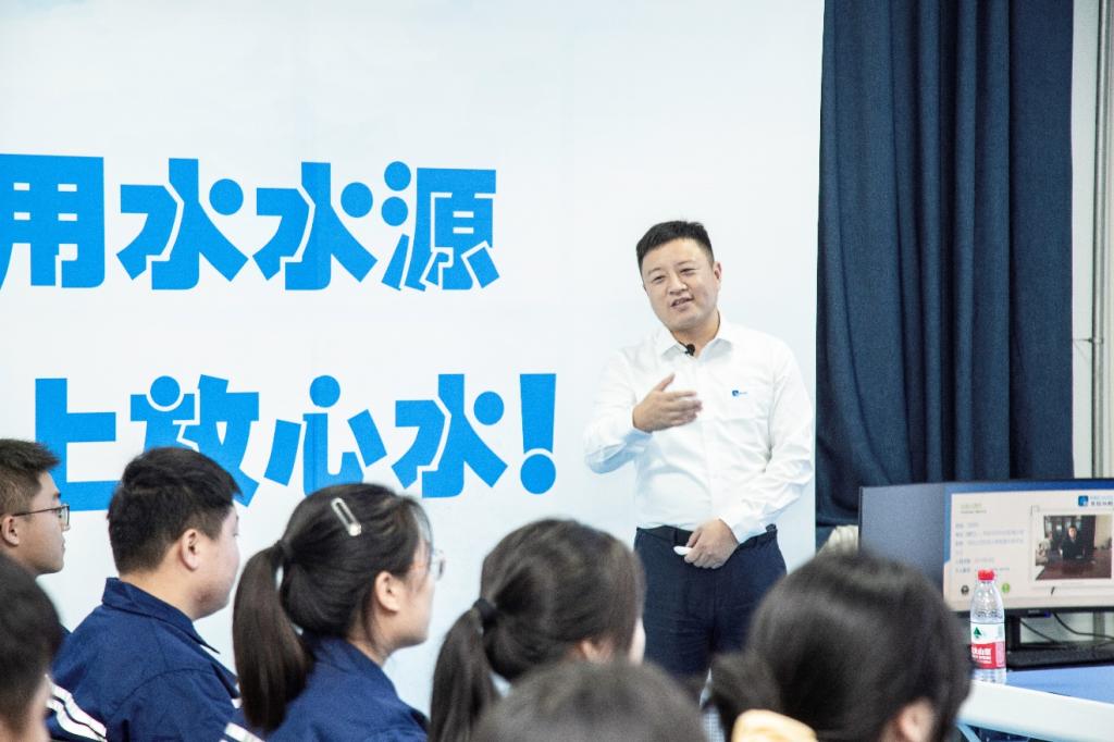 订单班开班仪式结束后,台州市路桥北控水务有限公司总经理兼台州智慧水务调度中心主任李国栋先生为订单班学生开展第一次企业专家授课。李国栋经理为同学们分享了智慧水务下运营管理的水厂介绍,讲述了现代水务行业通过“数智”赋能,打造覆盖“引水-制水-供水-用水-污水处理”全链条的“智慧水务”模式,课堂气氛轻松活跃。