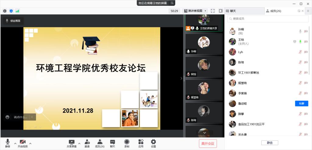 为扎实做好校友工作,凝聚校友力量,共享校友工作经验,助推学校和学院发展,11月28日,环境工程学院优秀校友论坛成功召开。由于疫情原因,本次论坛大会改成了线上进行,大会由环境工程学院校企合作办主任王恺老师主持,环境工程学院数名优秀校友学生干部参加了此次线上论坛。