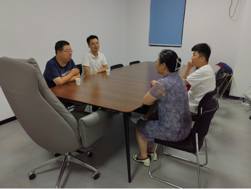 8月12日上午,调研人员来到焦新之行第二站--河南中弘国泰检测技术有限公司,洽谈学生实习就业和校企合作事宜。企业董事长郭寅平、人力资源部经理崔晓君等热情地接待了王主任一行,郭董事长给王主任一行介绍了公司的发展历程,表达了想要与我校合作的愿望。王主任介绍了我院专业发展情况,对于学生实习就业等事宜与企业达成了初步的合作意向。稍后,王主任一行看望了在那里工作的我院毕业生校友马鸣、申培杰等3人。