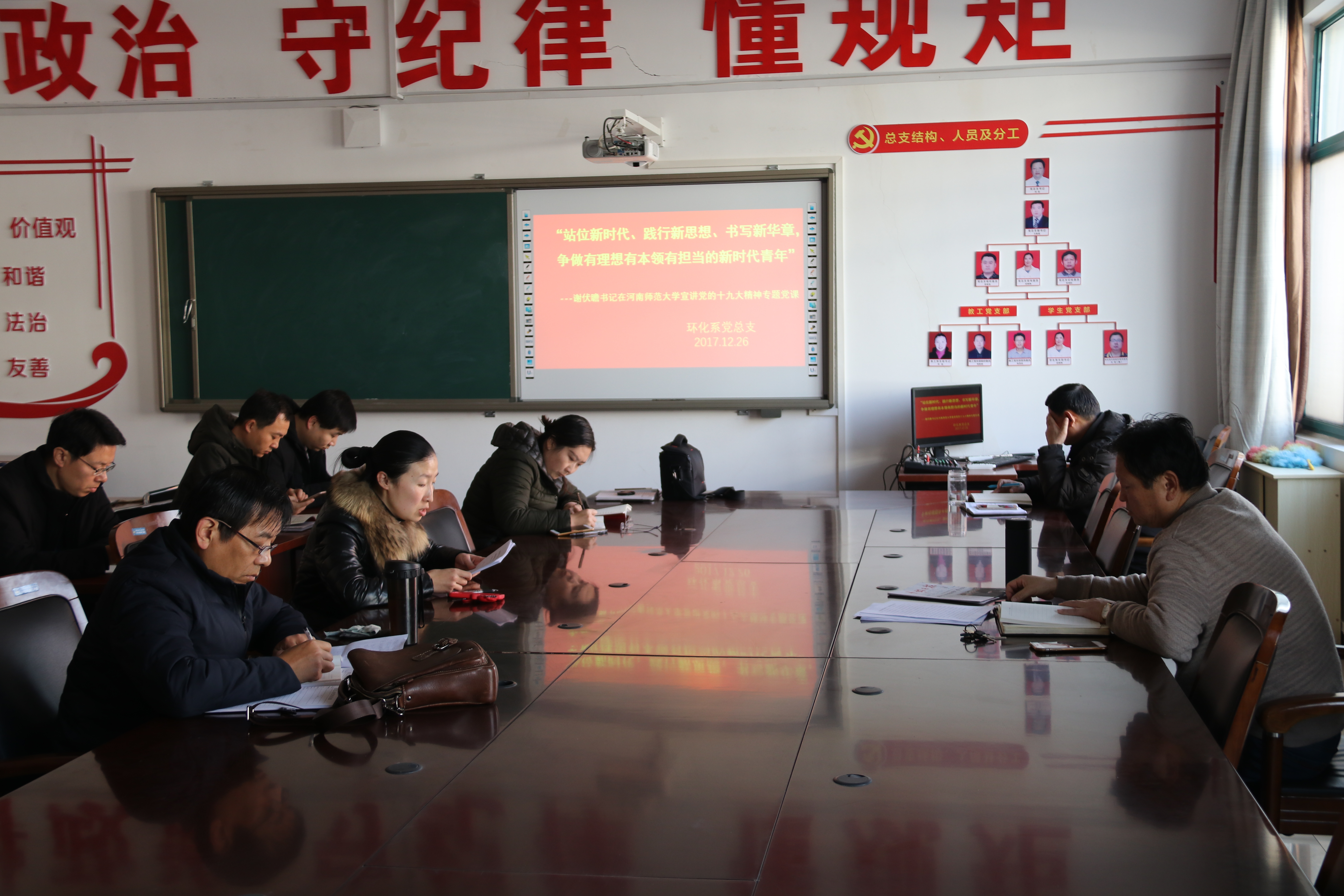 12月26日下午,我系召开专题政治理论学习会议,集中学习谢伏瞻书记在河南师范大学宣讲贯彻党的十九大精神的党课:“站位新时代、践行新思想、书写新华章,争做有理想有本领有担当的新时代青年”。环化系全体教职工党员参加了学习活动。学习活动由教工支部书记申森主持。