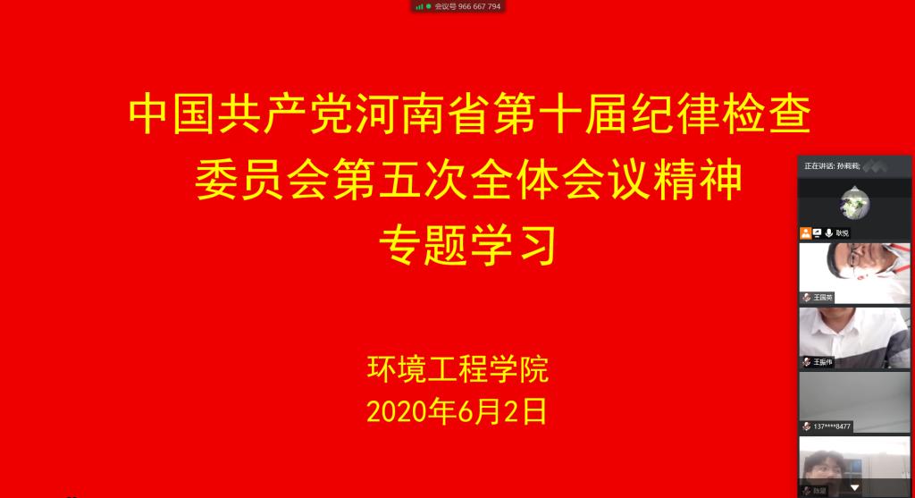 62号下午,环境工程学院党总支开展线上专题学习活动,学习《中国共产党河南省第十届纪律检查委员会第五次全体会议精神》,学院全体教职工参加,会议由学院党总支书记王国英主持。