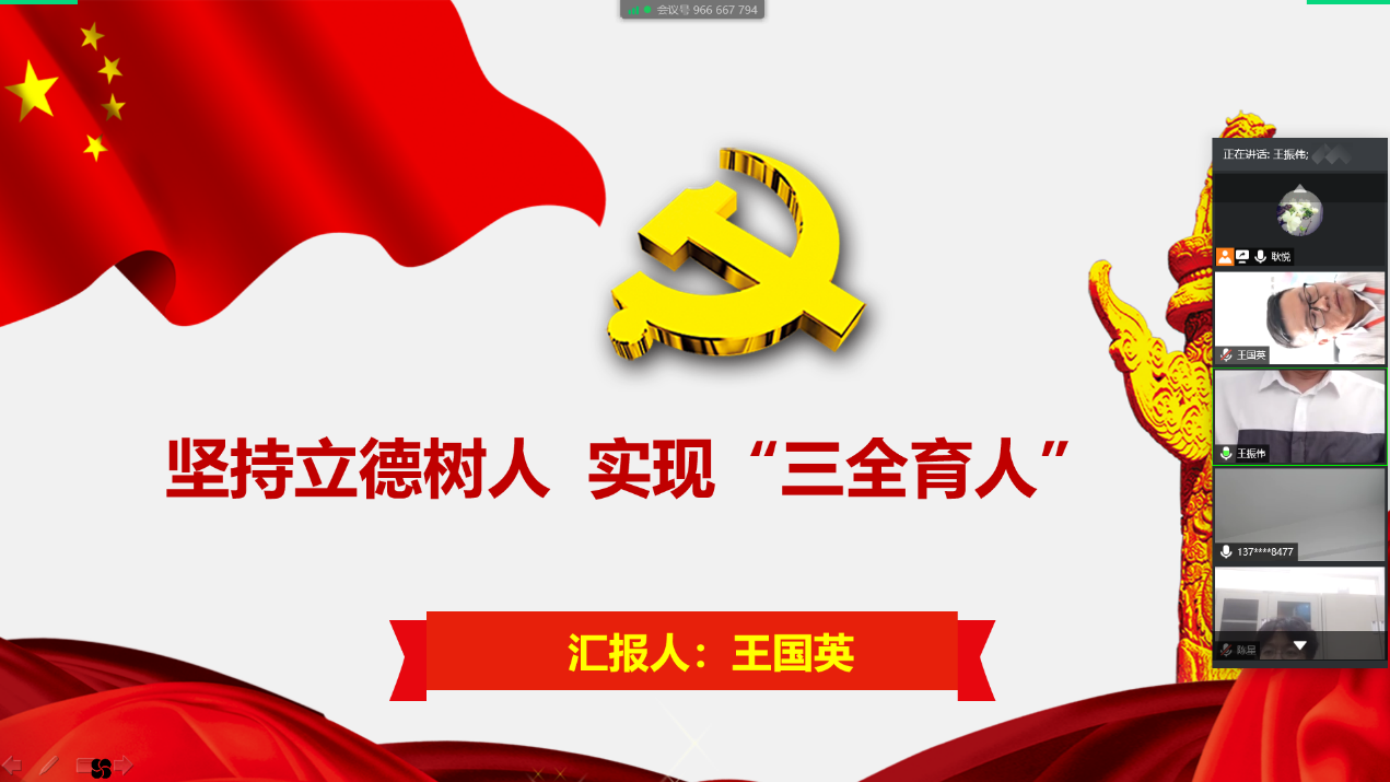 62日下午,环境工程学院党总支书记王国英以“坚持立德树人,实现三全育人”为主题,以腾讯视频会议形式为全体教师上了一堂理论内容翔实,意义深刻的党课。