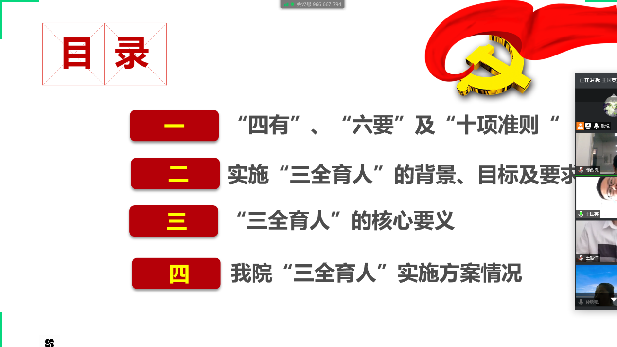 最后,王书记梳理了我院“三全育人”实施方案,要求大家要育人先育己,坚定理想信念、树立家国情怀,要注重学习积累,要敢于实践创新、脚踏实地做事,合力推进我院“三全育人”工作取得实效。