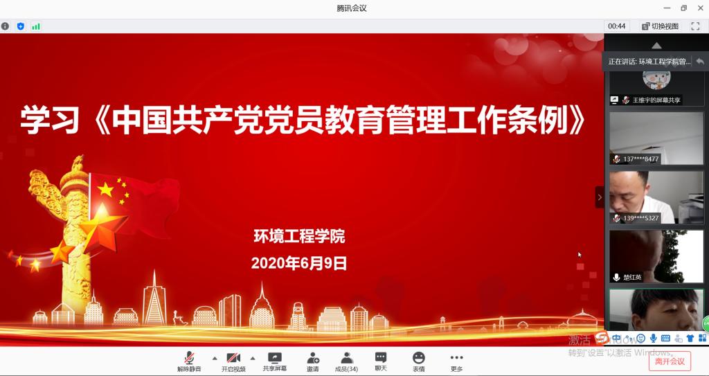 69号下午,环境工程学院党总支开展线上专题学习活动,学习《中国共产党党员教育管理工作条例》、《2019-2023年全国党员教育培训工作规划》。学院全体教职工参加,会议由学院党总支副书记曾宝亭主持。