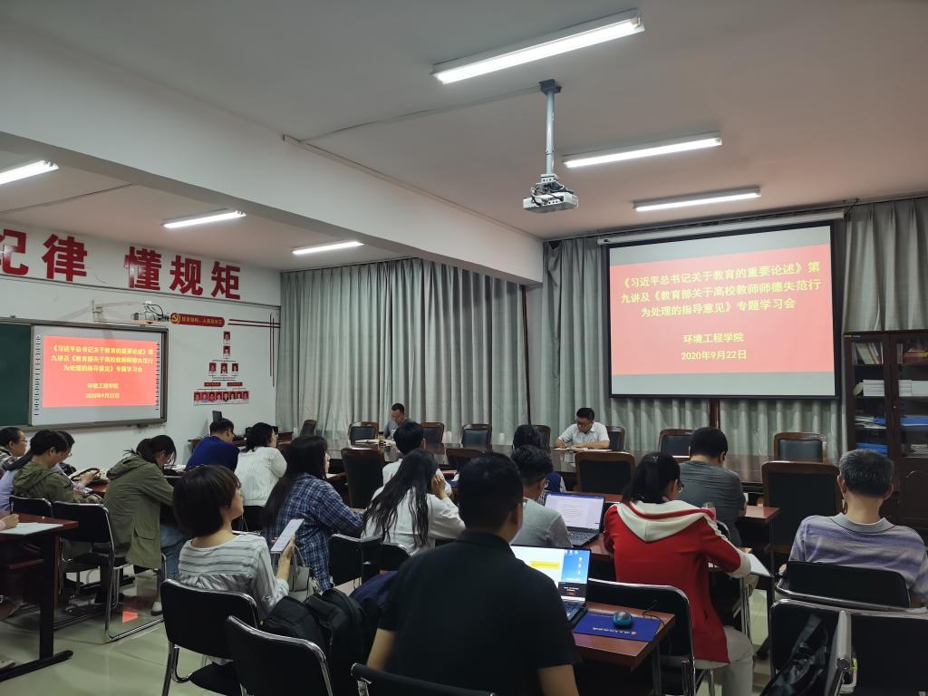 9月22日下午,环境工程学院党总支组织全体教师集中学习《习近平总书记关于教育的重要论述》第九讲及《教育部关于高校教师师德失范行为处理的指导意见》,会议由副院长(教工支部书记)王振伟主持,全体教师参加了此次专题学习会。