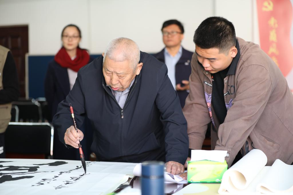开幕式结束后,开封市兰亭书画院著名书法家齐建立、著名画家赵明月分别做了主题分别为《中国书法艺术欣赏》《美术与中国画赏析》的主题报告。兰亭书画院12位书画家分别在商务与管理学院、环境工程学院党总支党员活动室挥毫泼墨,厚重的魏碑、纤长的篆书、潇洒的行书、方厚的楷书、奔放的草书、苗条的瘦金体让在场师生大饱眼福;出污泥而不染的荷花、傲霜坚韧的菊花、秀丽淡雅的芙蓉、芳香四溢的寿桃、嬉戏打闹的小鸟让在场师生赞不绝口;师生们认真观看书画家匠心运笔,聆听书画家孜孜讲解,近距离深切感受了各位书画家不吝笔墨的开放精神和一丝不苟的艺术品质。现场教学活动从上午9点持续直到中午近13点,师生仍然意犹未尽。