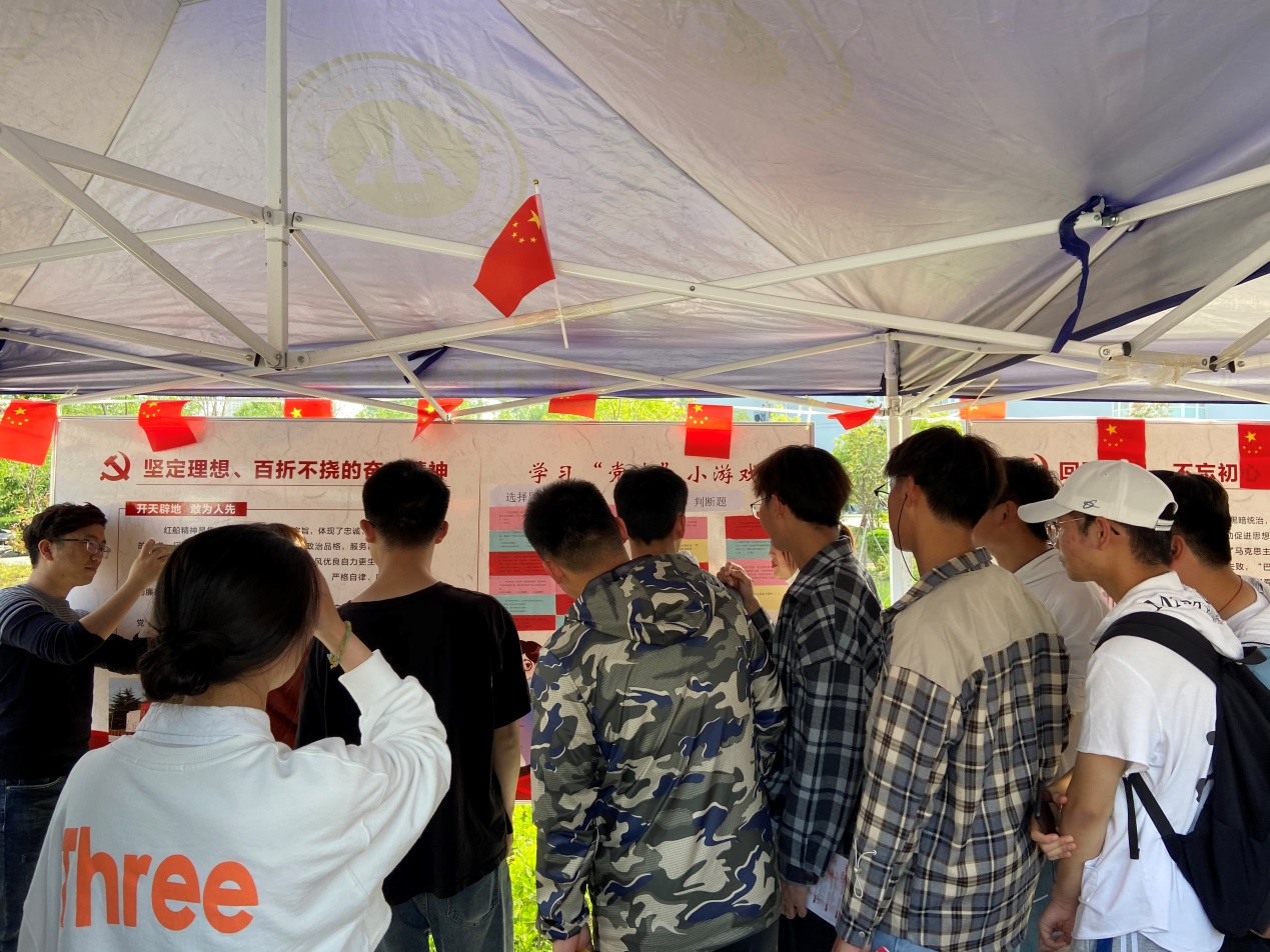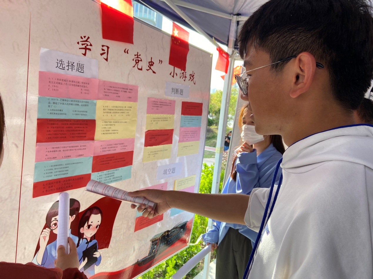 本次活动主要围绕新民主主义革命阶段的党史设置了党史知识展板,观看知识展板内容后可以抽取现场题目进行答题,答题正确可获一枚通关印章,同时,活动现场大屏幕里寻访播放党史讲解小视频,全体党员们一起追寻红色记忆,重温党的光辉历史,感受新时期红船精神。现场气氛热烈,师生们在轻松氛围中学到了很多关于党的历史方面的知识。