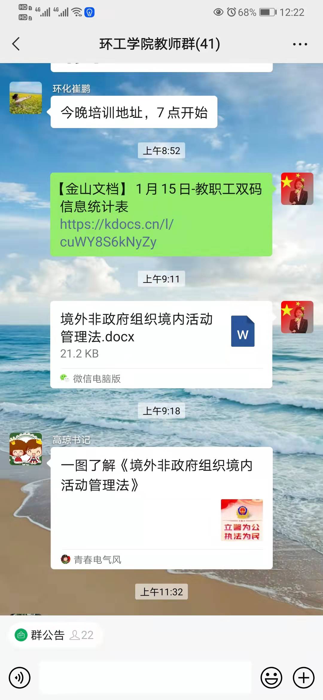 为深入贯彻习近平法治思想和党的十九届六中全会精神,进一步引导规范境外非政府组织在豫开展教育交流活动,维护社会政治稳定,根据我省境外非政府组织工作协调小组的通知以及河南省教育厅办公室《关于组织开展<境外非政府组织境内活动管理法>实施五周年普法宣传周活动的通知》(教外函〔2022〕7号)及学校文件要求,环境工程学院开展了《境外非政府组织境内活动管理法》实施五周年普法宣传周活动。