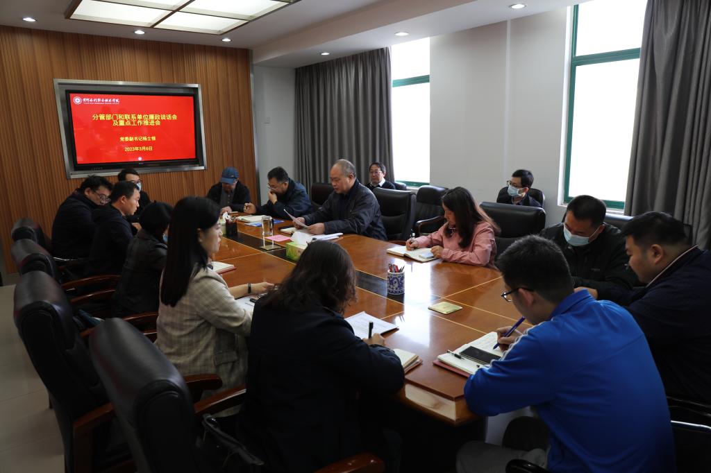 2023年3月6日上午,党委副书记、工会主席杨士恒在行政楼第三会议室主持召开分管部门和联系单位廉政谈话会及重点工作推进会。党委组织部、党委宣传部、“一站式”学生社区党工委、学生工作部、保卫部、离退休党总支(离退休工作处)、工会、团委、环境工程学院、旅游学院的中层正职参会。