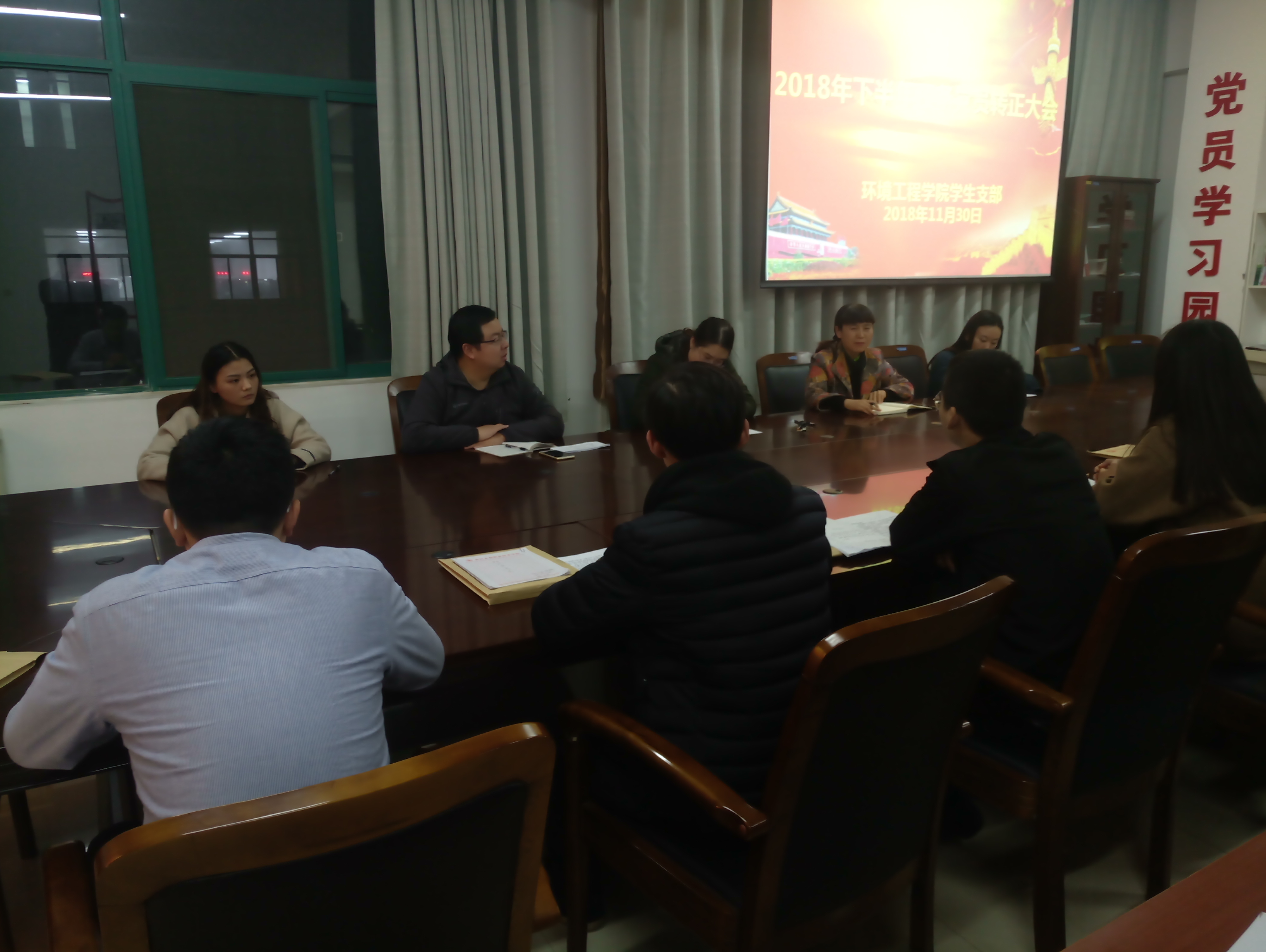 2018年11月30日下午,环境工程学院学生党支部在SY5405院会议室召开了2018年下半年学生党支部党员转正大会,院党总支副书记曾宝亭出席本次会议,大会由学生党支部书记武琳琳主持。