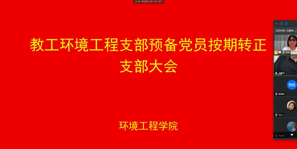 6月6日上午,教工环境工程支部召开预备党员转正大会,会议以腾讯视频会议的形式召开。环境工程学院全体教工支部党员及预备党员参加,会议由教工党支部书记王振伟主持。