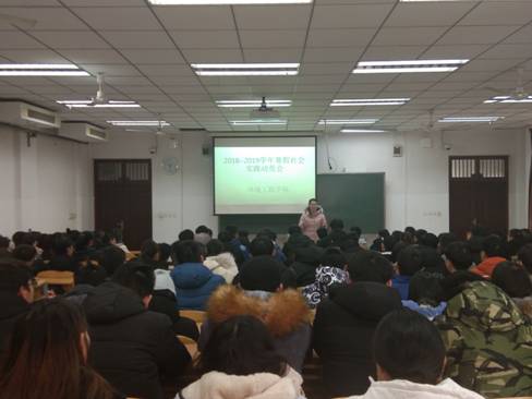 环境工程学院分团委于1月8日中午在JX6202召开了2018年寒假社会实践活动动员大会于。本次动员大会的主讲人有院分团委书记武琳琳、17级辅导员贾俊伟、18级辅导员马琳娜和实践部部长张雅昆,200余名学生参加大会。