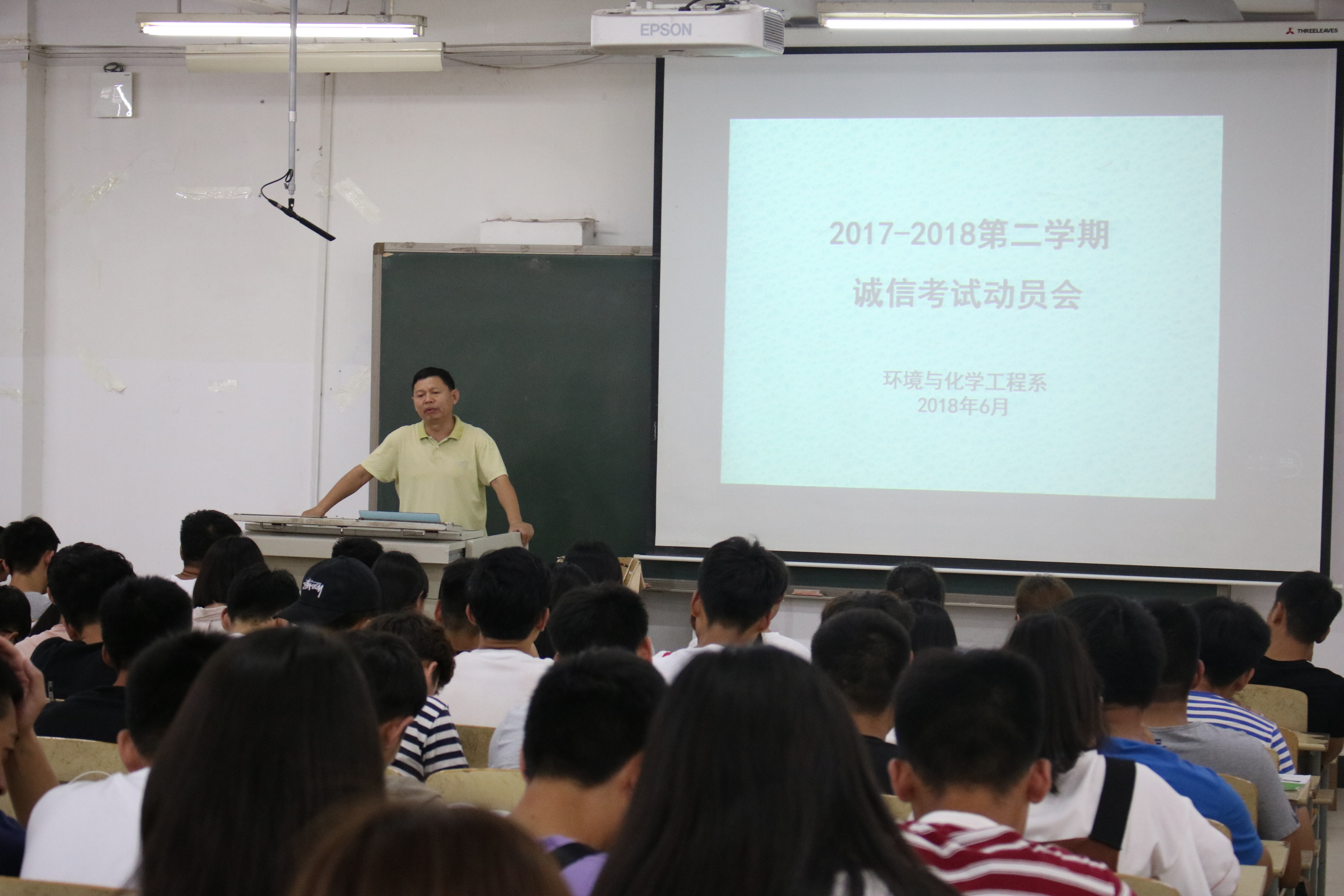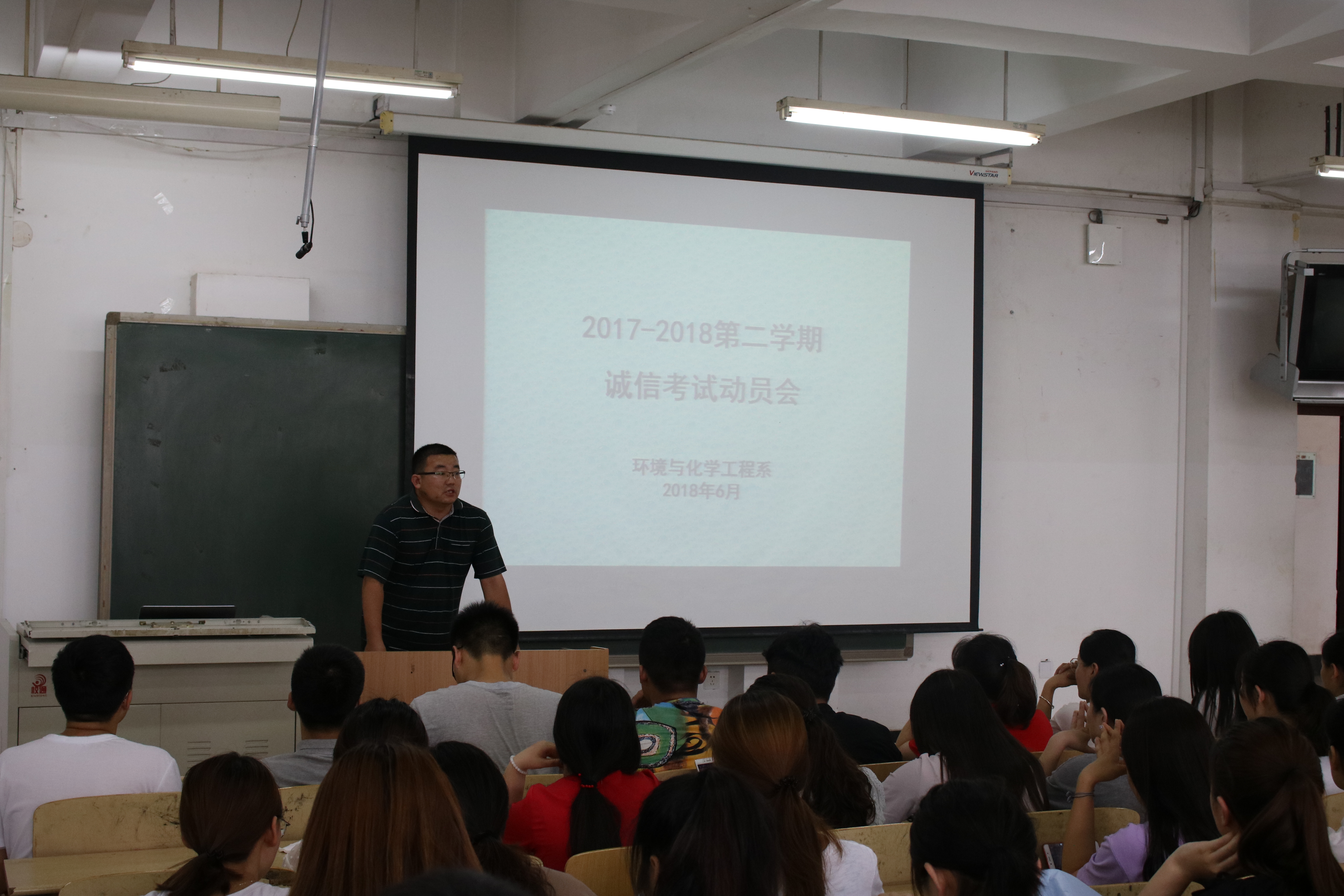 为进一步加强环化系学风建设和诚信教育,严肃考风考纪,营造公平、公正的考试氛围,环化系于2018年6月8日中午在JX2202、JX2302教室分别召开了2016级和2017级诚信考试动员大会,系副主任张尧旺、副书记王振强出席会议并发表讲话,系分团委书记武琳琳、16级辅导员王恺、17级辅导员贾俊伟和500余名学生参加了本次动员大会。