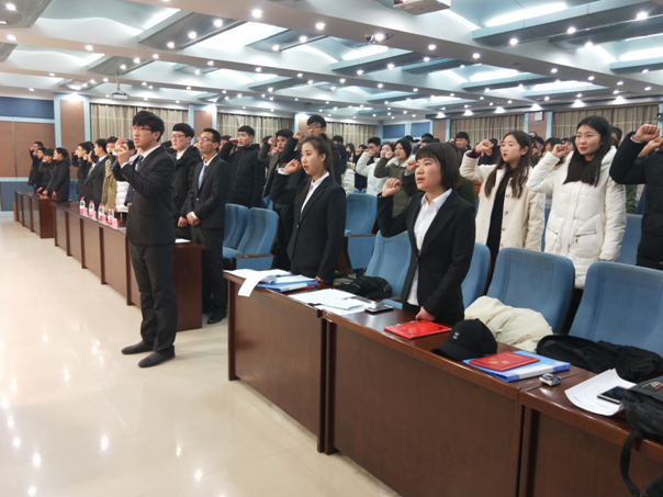 在雄壮的国歌声中,大会正式开始,武老师宣读了新一届团学干部的任命文件,并颁发了聘书。随后,2017届系学生会主席胡鹏阳发表离职感言,2018届系学生会主席林朝阳发表就职演讲,并通过PPT展示回顾了我系2017年度的团学工作。之后,全体学生干部进行了加入学生干部队伍宣誓。