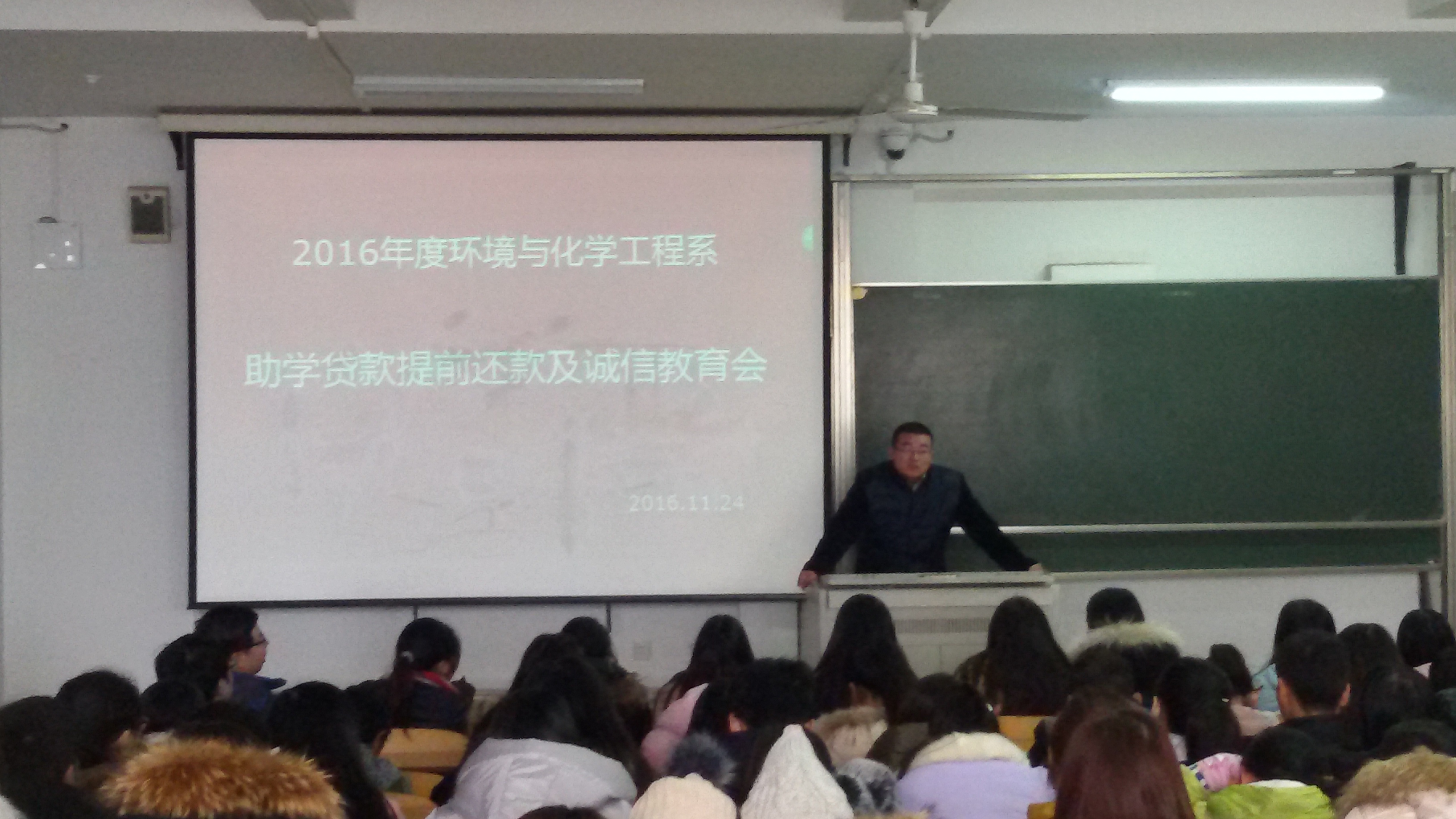 2016年11月24日中午,环化系在JX6202教室召开2016年助学贷款提前还款及诚信教育会,环化系党总支副书记王振强老师主持会议并讲话,系分团委书记、2014级辅导员武琳琳、2015级辅导员、资助专员马金菊、2016级辅导员王恺、资助助理罗慧宁、王东丽以及所有贷款的学生参加会议。