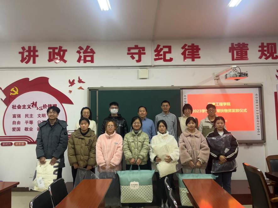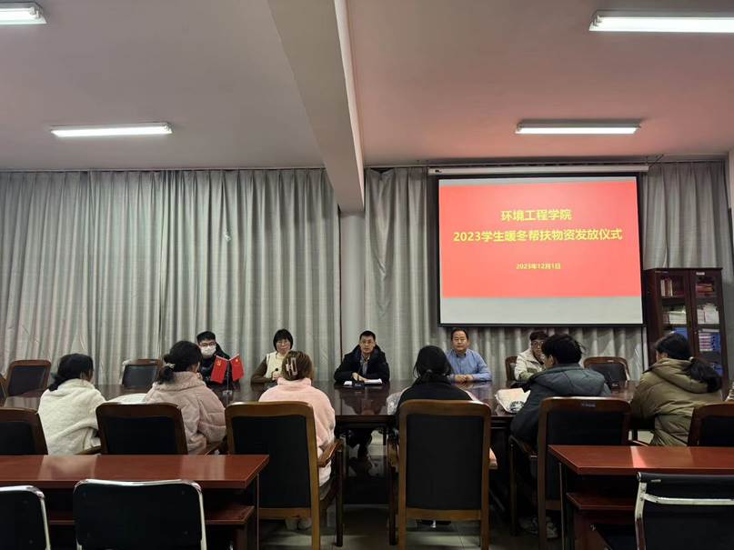 为了把党和国家以及学校对家庭经济困难学生的关怀落实落地,确保家庭经济困难学生能够度过一个温暖的冬天,2023年12月1日环境工程学院开展2023年冬季学生暖冬物资发放仪式,环境工程学院党总支书记冯涛,副院长姚新鼎,分团委书记孙莉莉,辅导员马琳娜、王维宇、苏文生参加了本次发放仪式。