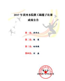 为喜迎 2018 年元旦,活跃校园文化生活,增强学校凝聚力,加强教职工体质,展现教职工风采,贯彻学校健身年计划,校工会在20171214日下发了举办首届黄河水院教职工 “踢毽子比赛”的通知,我系在刘书记的指导下,分工会成员认真组织教师们报名参赛。