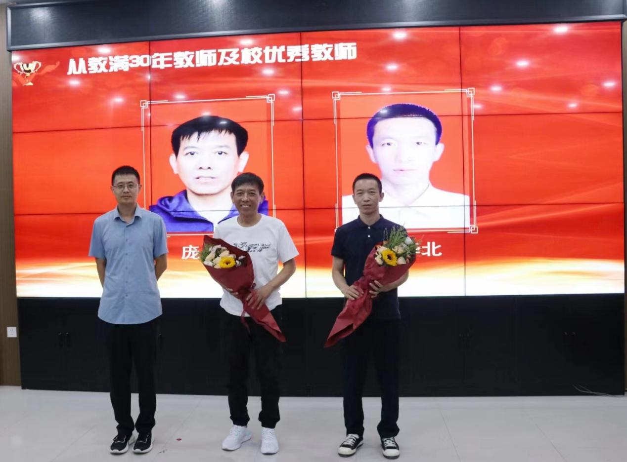 冯涛书记为从教满30年教师庞宏建、校优秀教师李华北颁奖