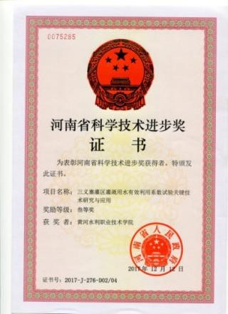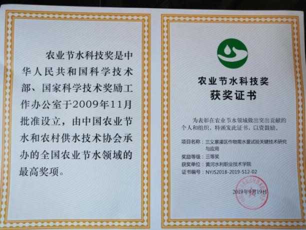 河南省科技进步奖证书 全国农业节水科技奖证书