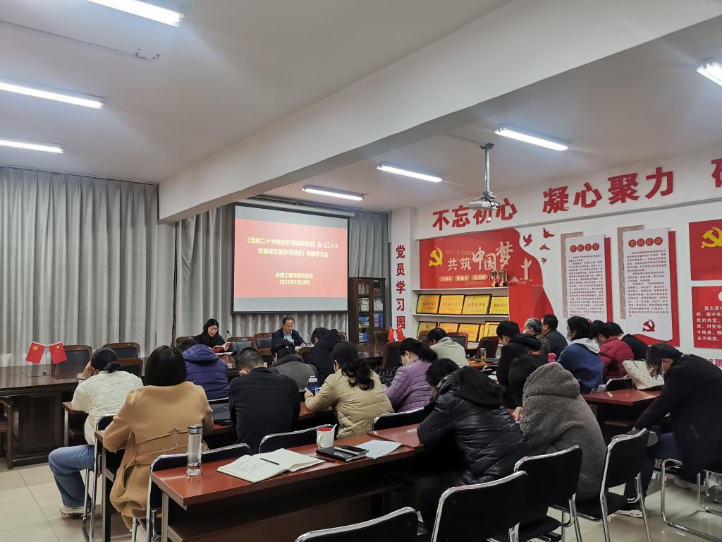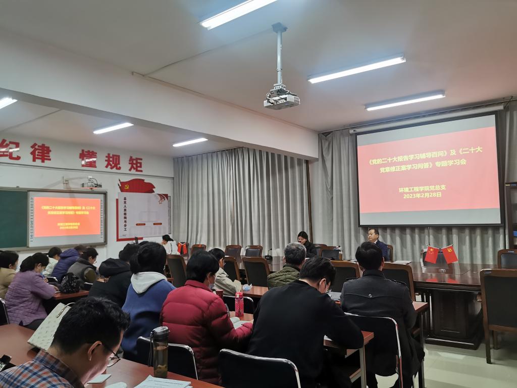 2月28日下午,教工环境工程支部在5号实训楼5405召开党的二十大精神专题学习会,主要学习《党的二十大报告学习辅导百问》及《二十大党章修正案学习问答》。本次会议由教工支部书记姚新鼎主持,宣传委员耿悦领学,全体教职工参加会议。